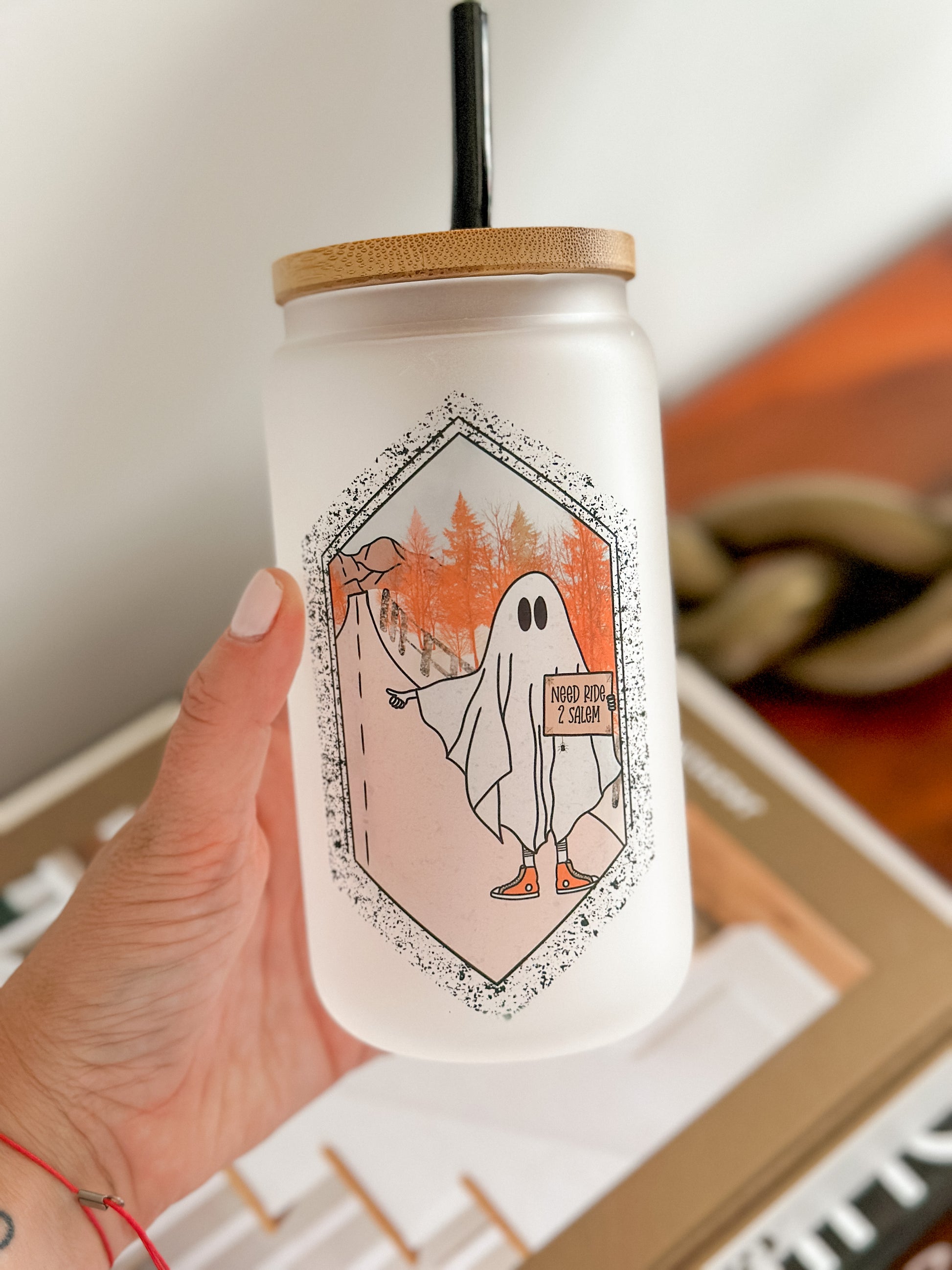 16oz frosted glass beer can comes with a bamboo lid and straw. The bamboo lid includes a sleek proof silicone sleeve which seals your drink in the glasses and prevents leaks.
